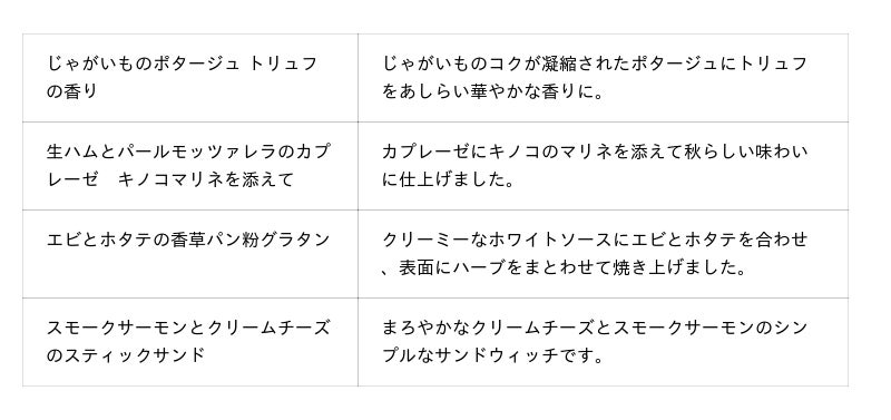 スイーツには、マスカットのソースとジュレのグリーンが目を引くレイヤードパフェや、2種のぶどうの食べ比べを楽しめるタルトをはじめとした、まさに”ぶどう尽くし”の8品がラインアップ。セイボリーは、トリュフ香る濃厚なポタージュや、秋らしくキノコを添えたカプレーゼなど4品が並びます。