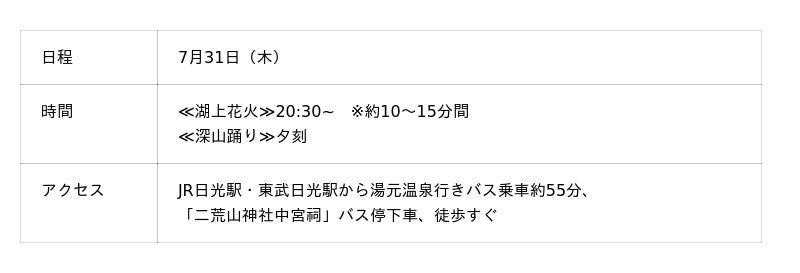 湖面に映る光と音が幻想的に重なり合い、奥日光ならではの「涼」の気候の花火は、まさに快適に花火を楽しめるオススメイベント。