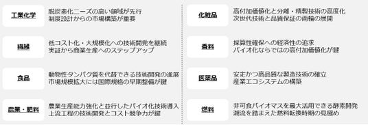「工業化学」では、石油化学による生産プロセスからの転換としてバイオ化技術の導入ニーズが高くなっています。コスト面の課題解決や大規模な商業生産を可能とするための工業化に関わる技術開発やマーケティング施策に加えて、LCA評価やマスバランス方式といった制度面からも導入を促進する施策が重要な位置づけとなっています。