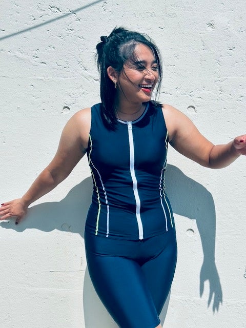 濃紺に真白のジップが走る、洗練さと美しさを強調