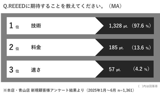 REEEDは、東京・青山エリアに本店を構える美容室で、日本でもトップクラスの技術と感性を活かした“ナチュラルで垢抜けるスタイル”で絶大な人気を誇ります。美容感度が高い層からの支持が厚く、1ヶ月で約2,000名のファンが東京近郊のみならず全国から訪れるほどのブランドへと成長しています。新規顧客の約98%が「REEEDの技術に期待して来店した」と回答しており、技術への高い信頼と実績を物語っています。(※2025年1~6月 自社顧客アンケート(n=1,361))