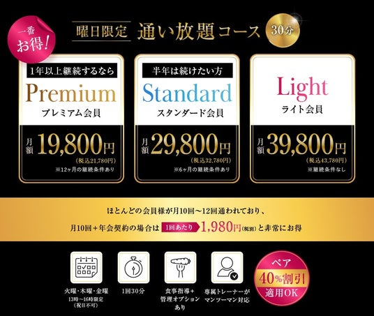 会員様の要望にあわせて「通い放題コース」「月毎コース」「回数券コース」「6ヶ月コース」をご用意しております。1ヶ月短期でコース回数を全て消化して頂いてもOKです。