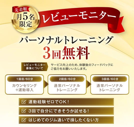 ※担当者スケジュール状況により対応できない場合がございます。特に「女性トレーナー希望の場合」、一部の店舗ではモニター対応不可となるケースがあるため、予めご了承ください。その場合、別担当にて残2回の対応は可能ですのでご安心ください。