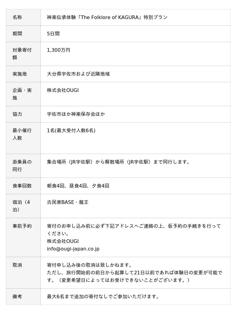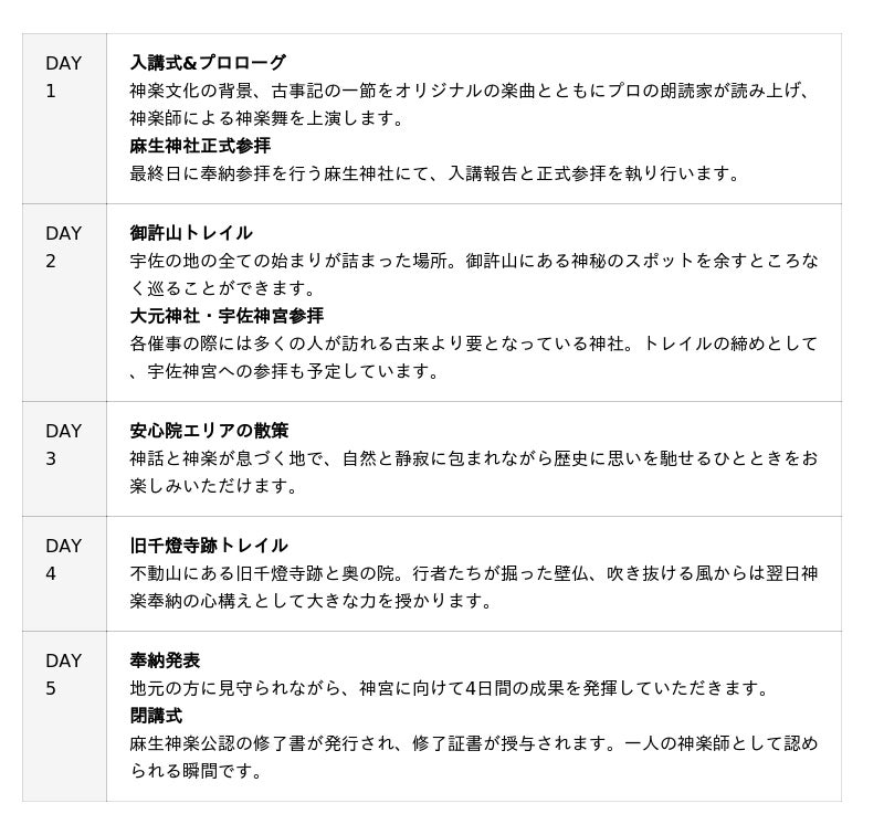今回申込受付を開始するのは、宇佐神宮御鎮座1300年の節目を記念した「The Folklore of KAGURA」特別プランになります。寄付額はふるさと納税としては異例の1,300万円。この金額に相応しく、宇佐市の精神文化に深く触れる5日間のプレミアムな体験を提供します。神楽伝承体験を通じて日本の本物の文化への理解を深めながら、参加者自身が奮闘し、成長する5日間の物語を、音楽と映像で永久保存する極めてパーソナルかつ芸術性に富んだ、特別なプログラムです。