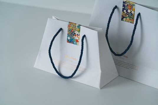ショッパーバッグにも藍色の友禅和紙を採用。金色の箔押しでさらに高級感を演出しています。