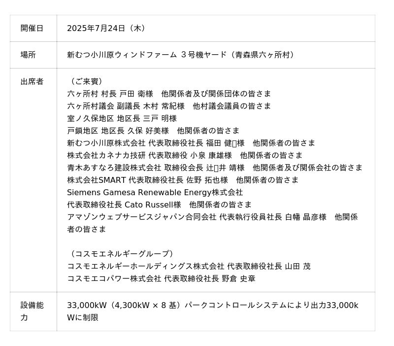 コスモエネルギーホールディングス株式会社(代表取締役社長:山田 茂)の子会社であるコスモエコパワー株式会社(代表取締役社長:野倉 史章)は、2025年7月1日より商業運転を開始した新むつ小川原ウィンドファームにおいて、地元関係者や工事関係者の皆さま、コーポレートPPA締結先であるAmazon関係者の皆さまにご参列いただき、2025年7月24日に操業安全祈願祭を執り行いました。