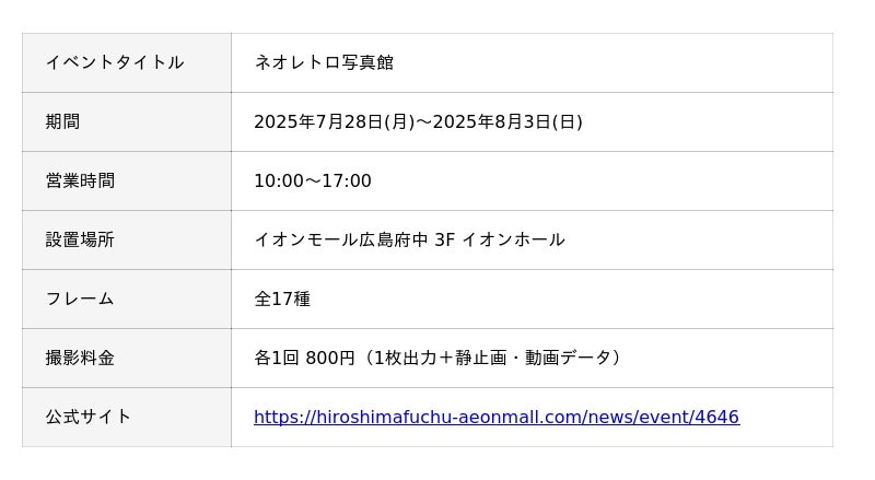 キタムラ・ホールディングス グループのピックハイブ株式会社(本社:東京都新宿区、代表取締役社長 兼 COO:大迫 由典)は、2025年7月28日(月)~2025年8月3日(日)の期間、イオンモール広島府中で開催されるイベント「ネオレトロ写真館」に、オリジナルフレームと背景で撮影できるフォトブースを設置します。