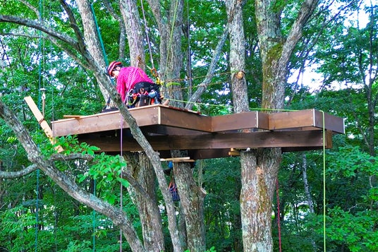 今回完成したツリーハウス「ノッポ」は、人工的な支柱を一切使用せず、1本のナラの高木だけで構造を支える設計を採用しています。この実現には、きたもっくが地域資源活用事業として展開するアーボリカルチャーに基づく樹木伐採技術が活用されました。高度なロープワーク技術のみで、制作の足がかりとなる高さ10mほどのデッキを安全に設置。これにより、森の生態系への影響を最小限に抑えつつ、高所のツリーハウスの設置を可能にしました。