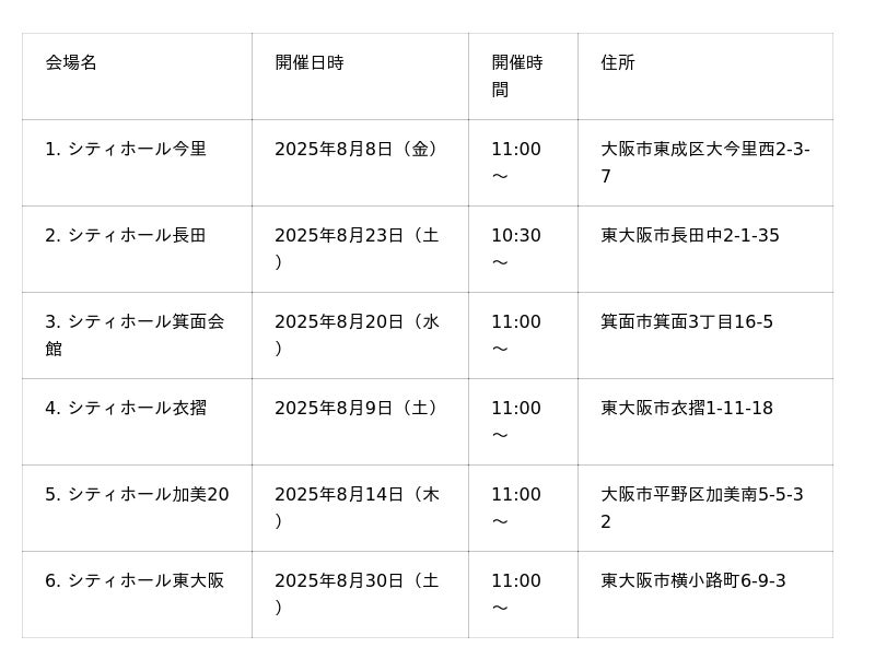 株式会社ベルコ(本社:大阪府池田市、代表取締役:斎藤 齋)は、2025年8月中に、ベルコシティホール大阪エリアの6会場にて、地域最大級のフリマイベント「Bellcoフリまっぷ」を順次開催いたします。