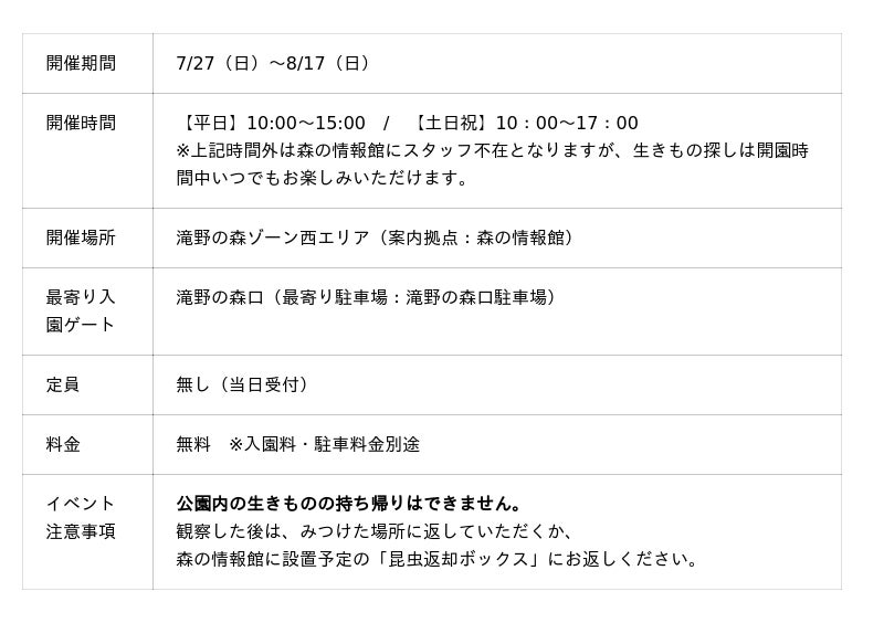 国営滝野すずらん丘陵公園(札幌市南区滝野247)では、7/27(日)~8/17(日)の期間、滝野の森西ゾーンの大自然の中で、虫さがしを楽しめるイベントを開催しております。