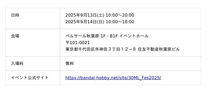 株式会社 BANDAI SPIRITS ホビーディビジョン(本社:東京都港区)は、ファンの皆様と共に創りあげてきたプラモデルブランド「30 MINUTES LABEL」(以下、30ML)のファン待望の単独イベント『30 MINUTES LABEL FES.2025』を秋葉原で2DAYS開催します。
