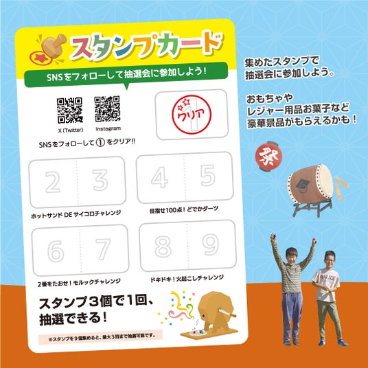 本イベントでは参加無料で楽しめる「縁日ブース」が登場。おもちゃとキャンプ用品を使った様々なチャレンジにトライ!スタンプを集めたら豪華景品が当たる「抽選会」に参加しよう。