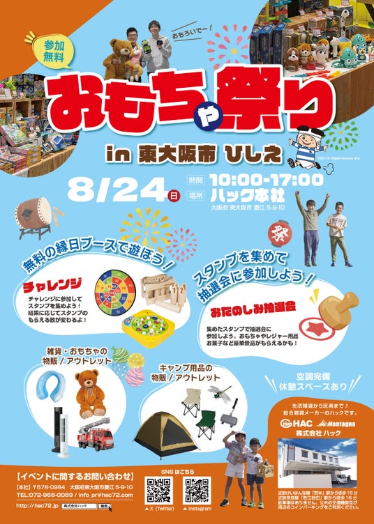 総合雑貨メーカーの株式会社ハック(本社:大阪府東大阪市、代表取締役:有山哲也)は、2025年8月24日(日)に「おもちゃ祭りin東大阪市 ひしえ」を「ハック本社」にて開催します。