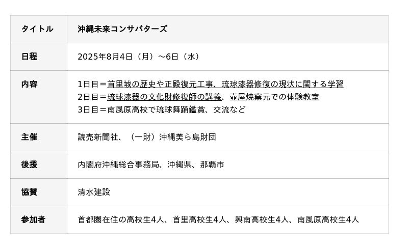 一般財団法人沖縄美ら島財団 は2023年度から、首里城火災(2019年)で被災した美術工芸品の修理の現状や技術を次世代へ伝えるプログラム「沖縄未来コンサバターズ」に取り組んでいます。本年も8月4~6日に開催します。首都圏と沖縄の高校生16人に琉球漆器の修理の現場を知ってもらい、伝統技術の継承につなげる2泊3日のプログラムです。若い世代が伝統文化を継承する大切さを理解し、自らの体験として伝えるきっかけづくりを目指します。