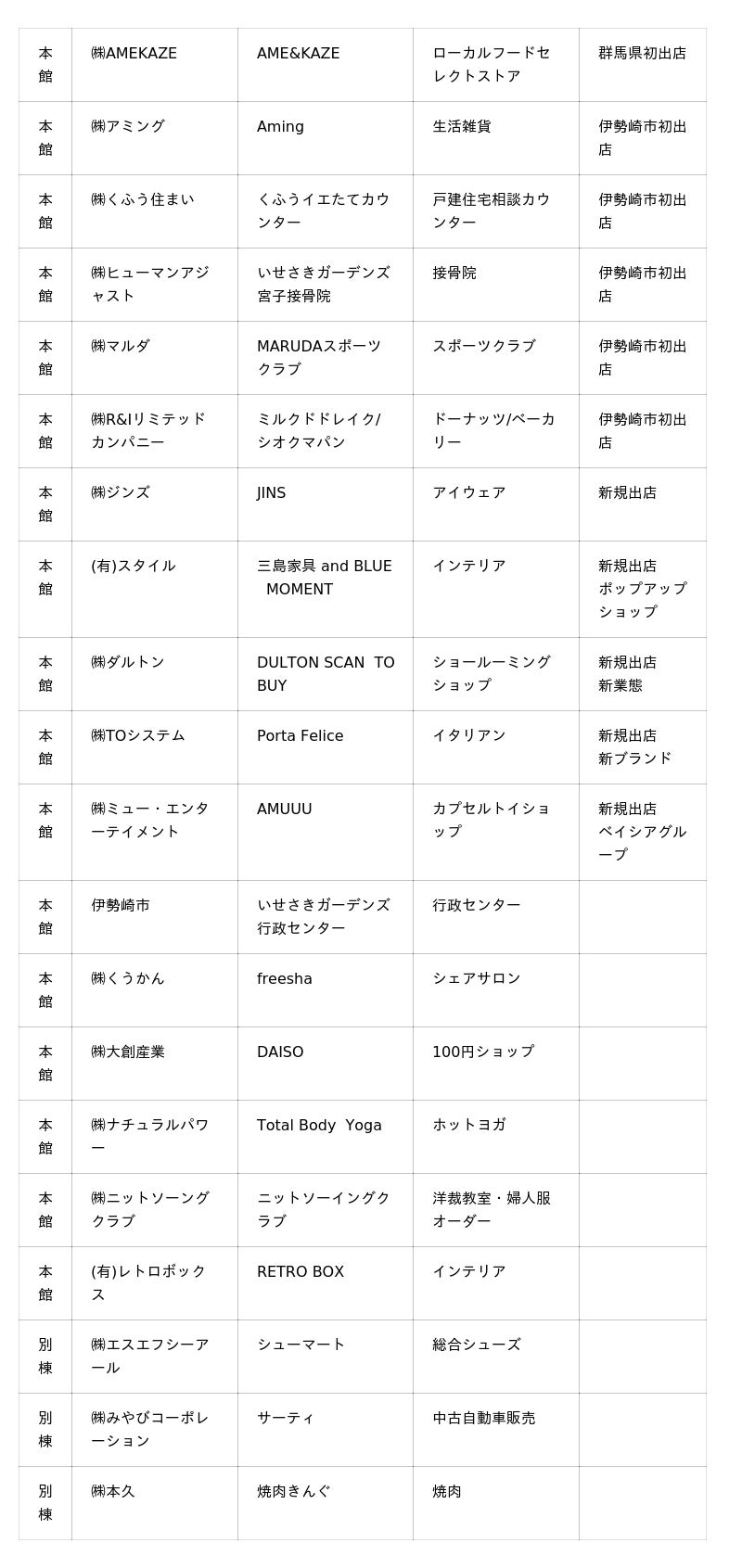 イン+アウトショップ全27店舗で構成。新規出店16店舗の内、伊勢崎市初が7店舗、群馬県初、商業施設内初がそれぞれ1店舗、それに他のモールや施設ではお目見えしたことのない新業態や新ブランドなど、新鮮な顔ぶれで地域の皆さまのご来店をお待ちしています。
