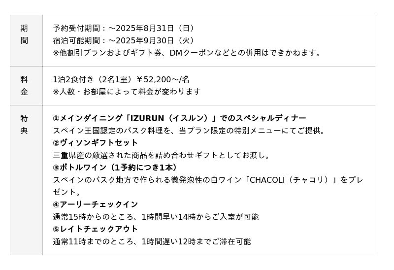 そのほか、スペインのバスク地方で作られる微発泡性の白ワイン「CHACOLI(チャコリ)」や三重県産の厳選商品を詰め合わせたギフトのプレゼントに、アーリーチェックイン、レイトチェックアウトをお付けします。