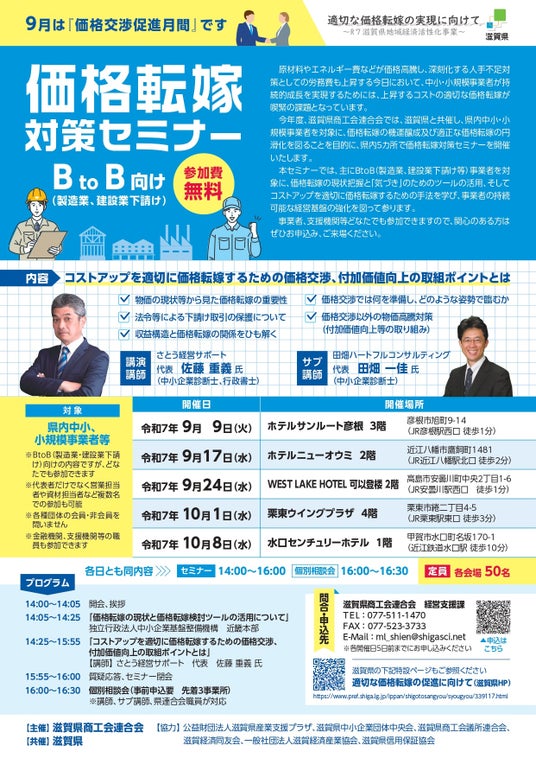 滋賀県商工会連合会(住所:大津市打出浜2番1号 コラボしが21 5階、会長:上西 保)は、滋賀県と共催し、滋賀県内の中小・小規模事業者を対象に、9月から10月にかけて、県内5カ所で「価格転嫁対策セミナー」(BtoB 製造業・建設業下請け向け)を開催します。