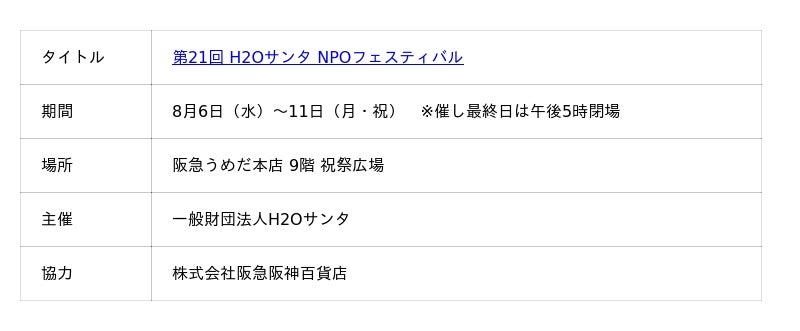 エイチ・ツー・オー リテイリンググループの社会貢献団体である一般財団法人H2Oサンタ(大阪市北区)は、8月6日から11日まで阪急うめだ本店(同)で「第21回 H2Oサンタ NPOフェスティバル」を開催します。まだ広く知られていないこども支援に取り組む社会貢献団体の活動をパネルと動画でご紹介し、地域の方々とつなぐイベントです。
