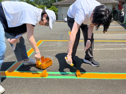 「バット博士記念ホーム」で、経年劣化により薄くなった駐車場の線を引きなおすボランティア