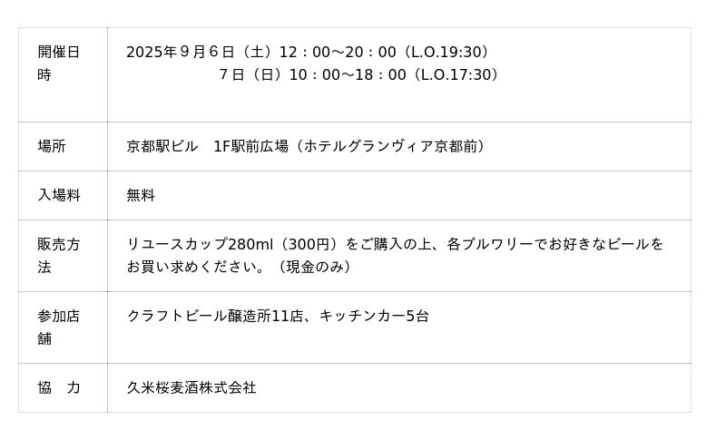 京都駅ビルビアフェスタ実行委員会と京都駅ビル開発株式会社(代表取締役社長:橋本修男)は、関西を中心に11の醸造所のクラフトビールが楽しめる『京都駅ビルビアフェスタ』を9月6日(土)、7日(日)の2日間、京都駅前広場で開催いたします。