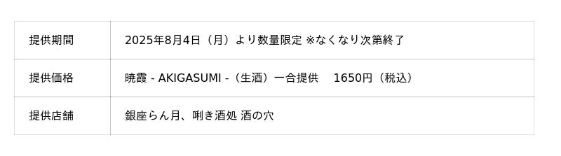 香りの老舗〈株式会社日本香堂〉(本社:東京都中央区)は、人気銘柄「冩樂(写楽)」「會津宮泉」で知られる福島・会津若松の老舗酒蔵〈宮泉銘醸株式会社〉と初めてタッグを組み、香りと味わいの調和を追求した純米吟醸酒『暁霞 -AKIGASUMI-』を共同開発いたしました。その“できたての生酒”を、2025年8月4日(月)より、東京・銀座の名店〈銀座らん月〉および〈唎き酒処 酒の穴〉にて、数量限定で提供いたします。