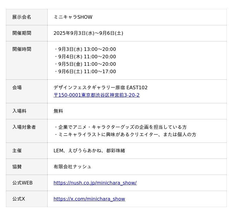 グッズデザイナーのLEM、イラストレーターのえびうらあかね、都彩珠緒が主催する、ミニキャライラストに特化した展示イベント『ミニキャラSHOW』が、2025年9月3日(水)から6日(土)までの4日間、デザインフェスタギャラリー原宿 EAST102にて開催されます。