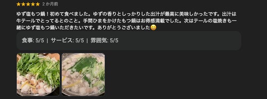 「博多駅周辺(福岡市博多区)」において、「ゆず塩もつ鍋」を看板商品として提供するもつ鍋専門店は当店のみであることを確認しております。そのため、「博多初」という表現は当社独自の調査結果に基づいて使用しております。