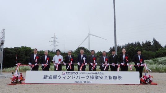 コスモエネルギーホールディングス株式会社(代表取締役社長:山田 茂)のグループ会社であるコスモエコパワー株式会社(代表取締役社長:野倉 史章)は、建て替え工事を終え2025年3月1日より商業運転を開始した新岩屋ウィンドパークにおいて、操業安全祈願祭を執り行いましたのでお知らせします。
