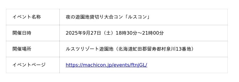 株式会社リンクバル(本社:東京都中央区、代表取締役社長:吉弘和正、証券コード:6046、以下「リンクバル」)が運営するイベントECサイト「machicon JAPAN」は、2025年9月27日に北海道の「ルスツリゾート遊園地」にて開催される【夜の遊園地貸切り大合コン(ルスコン)、以下「本イベント」】の掲載を開始いたしました。