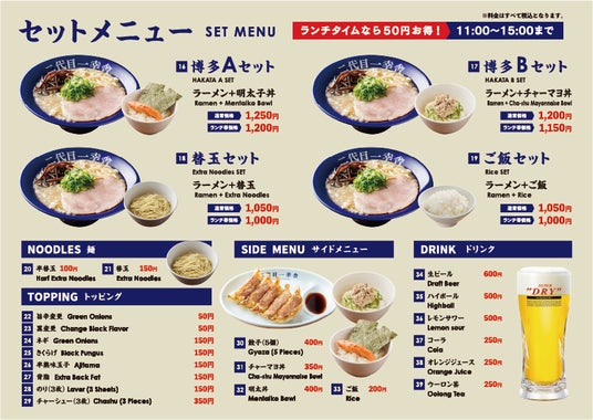 ラーメン類をご注文いただいたお客様、各日先着100名様に総額495万円相当の「グランドオープンスペシャルクーポン綴り券」をプレゼント!(内容:豚骨ラーメン一杯無料券1枚、餃子無料券2枚、チャーマヨ丼無料券2枚、博多明太丼無料券2枚、トッピング無料券2枚、アルコール無料券1枚(全10枚))※1回の来店でラーメン1杯ご注文の方に限り1枚利用可能。※豚骨ラーメン一杯無料券利用時は除く。※他のクーポン併用不可。※セットメニューではご利用できません。※有効期限は2025年10月31日までが4枚、2025年12月末までが6枚