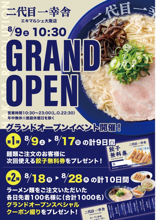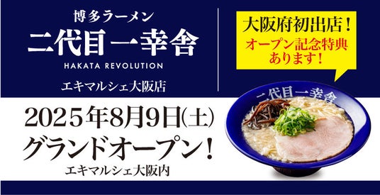 世界12カ国90店舗以上を展開、ラーメンのグローバルブランド、博多一幸舎や幸ちゃんラーメンを運営する、株式会社ウインズジャパンホールディングス(所在地 福岡県福岡市博多区、代表取締役社長 吉村 幸助 以下当社)は、この度「博多一幸舎 エキマルシェ大阪店」を、博多ラーメン「二代目一幸舎」へブランドチェンジし2025年8月9日(土)にグランドオープンいたします。当社が運営する二代目一幸舎は、ショッピングモールなど商業施設をはじめ、駅中やオフィスビルなど、ビルインに特化したブランドで、本場の博多豚骨ラーメンを気軽にお召し上がり頂けるブランドです。地域の皆様、観光でお越しの方々、おひとりさまからファミリーさま、⽼若男女問わず幅広いお客様に楽しんでいただけるよう営業をしてまいります。