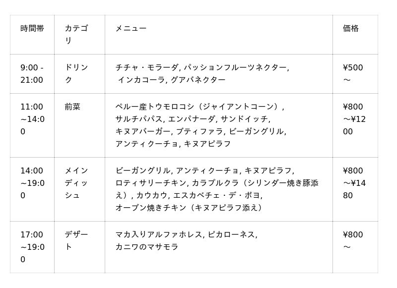 ・ 試飲・試食:会期中、月替わりで1日400食、昼夜3種類ずつ絶品ペルー料理を無料でご提供。その他にも午前にはペルー産コーヒーやホットチョコレート、夜にはピスコサワーなどを無料でご提供。※数に限りがございます。