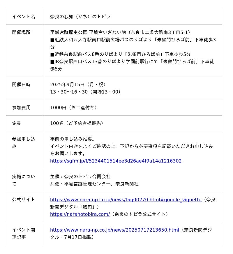 奈良新聞、および奈良新聞デジタルでの連載開始から2周年を記念し、奈良新聞社(本社:奈良市法華寺町2番地4、田中篤則代表取締役社長)は、奈良のトビラ合同会社・平城宮跡管理センターとの共催で、トークイベント「奈良の我知(がち)のトビラ」を奈良市の平城宮いざない館にて、9月15日(月・祝)に開催します。