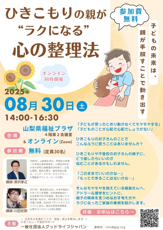 生きる力をを育むことで孤立孤独を解消します~ひきこもり・不登校サポートの一般社団法人グッドライフジャパン(山梨県北杜市須玉町江草5573 代表:川田史郎)は、アドラー心理学をヒントに、ひきこもり・不登校の子をもつ親御さんに向けた「ひきこもりの親が“ラクになる”心の整理法」を開催いたします。