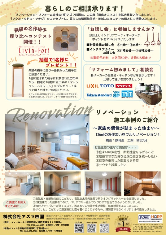 株式会社アズマ四国(本社:徳島県阿南市)は、設立45年のリフォーム・リノベーション会社です。徳島オフィスを移転拡大し、2025年8月23日(土)24(日)にオープニングイベントを開催いたします。