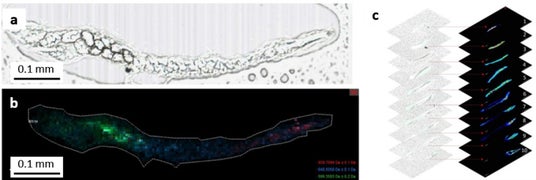 (a)線虫切片の光学顕微鏡画像と(b)質量分析イメージング画像。赤青緑の色は、それぞれ異なる分子量の脂質分布を表している。(c)10µm毎の連続切片画像。