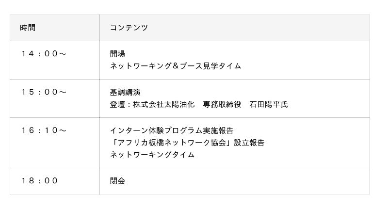 当日は、1DAYインターンシップを実施した企業と学生が登壇し、実際の取り組みや今後の展望について発表。また、すでにアフリカに進出しているグローバル企業「株式会社太陽油化」より、成功事例やアフリカビジネスにおけるポイント・メリットについてお話しいただきます。