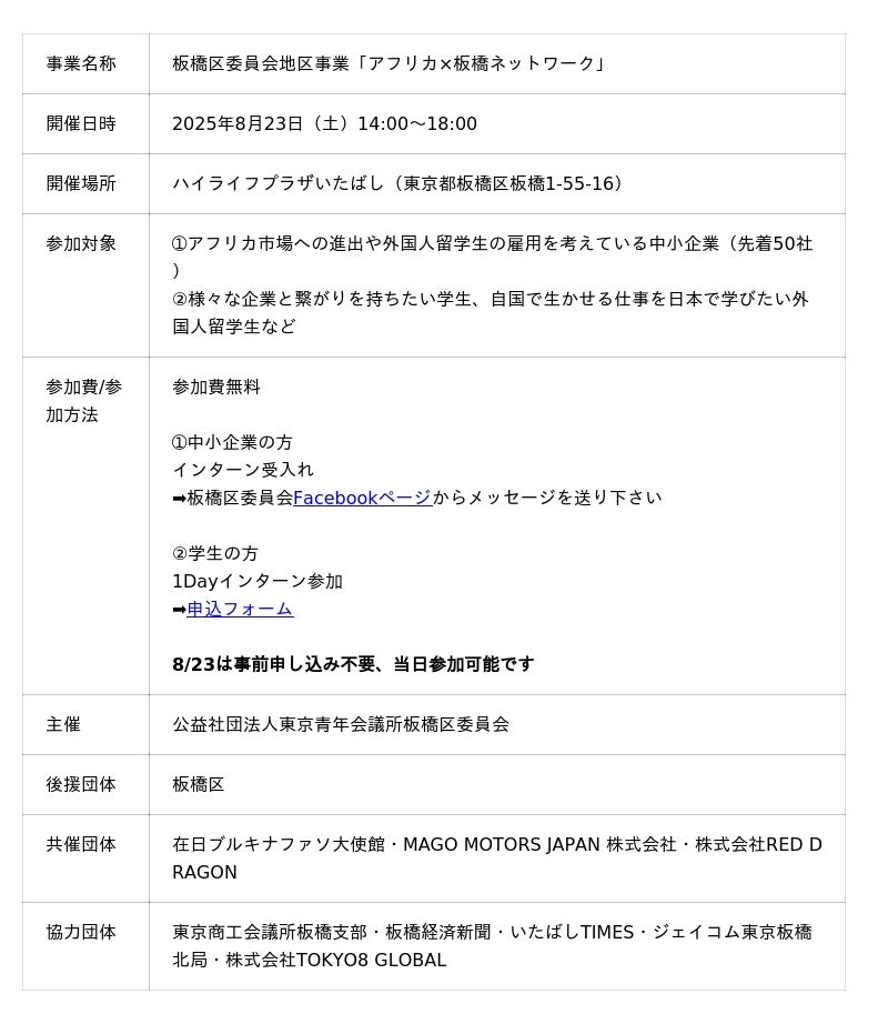 公益社団法人東京青年会議所 板橋区委員会は、2025年8月23日(土)に国際ビジネスイベント「アフリカ×板橋ネットワーク」を、ハイライフプラザいたばしにて開催いたします。