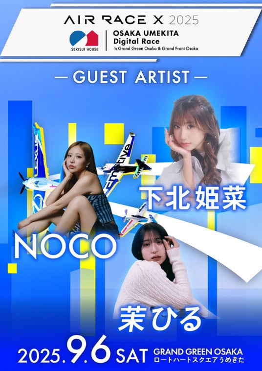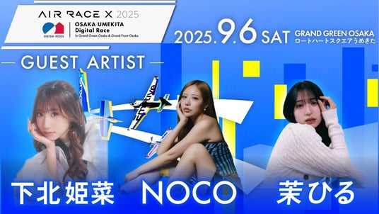 025年9月6日(土)大阪・うめきたエリアにて開催される空の次世代モータースポーツ「AIR RACE X(エアレース・エックス)」のシリーズ最終戦「エアレース X 2025 積水ハウス 大阪うめきたデジタルレース in グラングリーン大阪 & グランフロント大阪」に注目の若手アーティスト、茉ひる(まひる)、下北姫菜(しもきたひな)、NOCO(のこ)の出演が決定しました。