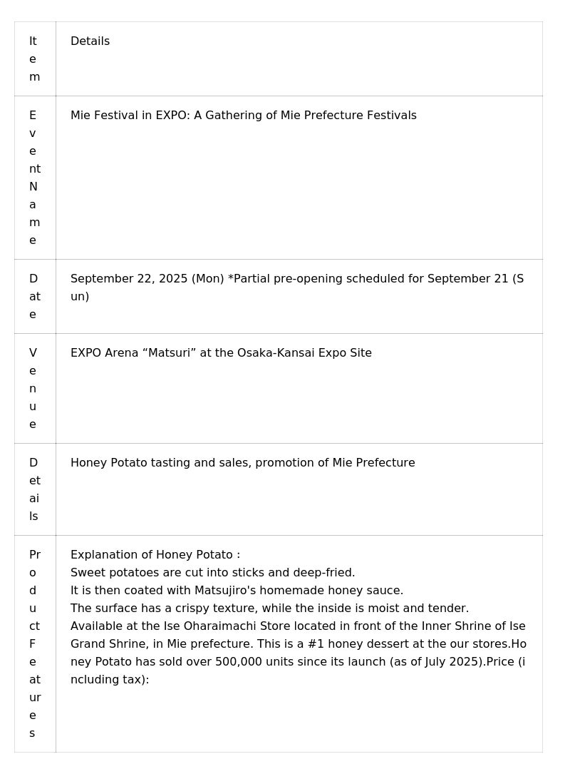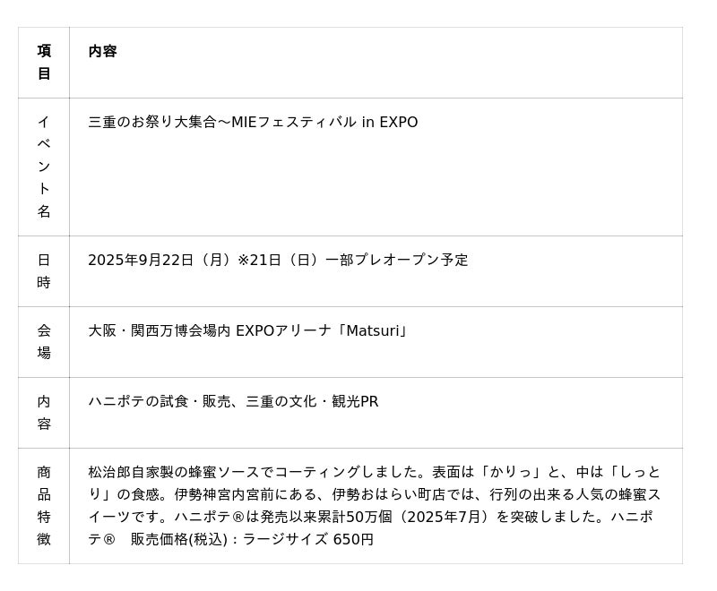 株式会社松治郎の舗(本社:三重県松阪市、代表取締役:水谷俊介)は、2025年9月22日(月)に大阪・関西万博のEXPOアリーナ「Matsuri」で開催される「三重のお祭り大集合~MIEフェスティバル」に出展します。今回の出展では、看板商品「ハニポテ(HONEY POTATO)」を通じて、三重県伊勢の豊かな自然と食文化の魅力を国内外に発信いたします。We will be exhibiting at the “Mie Festival: A Gathering of Mie Prefecture Festivals” to be held on Monday, September 22, 2025, at the EXPO Arena ‘Matsuri’ at the Osaka-Kansai Expo. Through our signature product, “Honey Potato,” we will showcase the rich natural environment and food culture of Ise, Mie Prefecture, to audiences both in Japan and abroad.