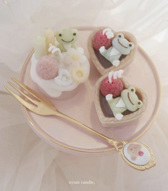 マットで柔らかな質感の大豆で作られているソイワックスでかえるのピクルスを淡い世界観で表現した、かえるのピクルスと<nyam candle.>によるコラボキャンドル。大切な方へのギフトや、自分へのご褒美におすすめの一品です。