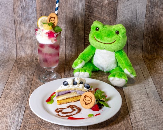 カラフルなゼリーがきらめくソーダフロートと、お好きなケーキが選べるコラボプレートを用意しました。かえるのピクルス柄が可愛い遊び心をくすぐるコラボメニューです。