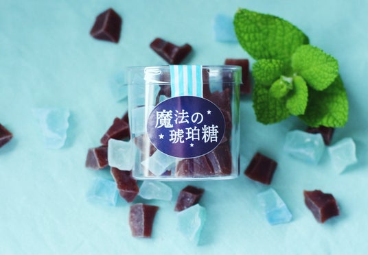 琥珀糖は、寒天と砂糖で作られる伝統的な和菓子。美しい見た目から「食べる宝石」とも言われています。外側はシャリっと、中はプルプルとした不思議な食感が楽しめます。<魔法の琥珀糖>では、包丁や型を使わず、一つひとつ手でちぎって成型し、ランダムな断面が宝石のような美しさを生み出しています。夏におすすめの涼やかな味わいの「チョコ×ミント」も販売します。