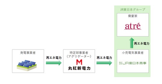 丸紅新電力株式会社(以下、丸紅新電力)と株式会社JR東日本商事(以下、JR東日本商事)は、株式会社アトレ(以下、アトレ)へ、太陽光発電所由来の再生可能エネルギー電力(以下、再エネ電力)の供給を開始しました。