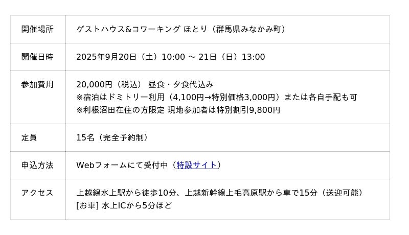 そんな楽しさを、ワークや体験を通して、今回いらっしゃる皆さんと共有したいと思っております。自然豊かなみなかみ町で、お待ちしております!