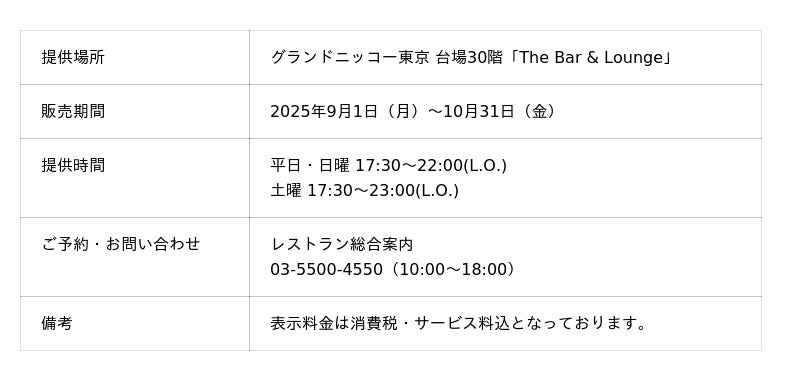 「東京を楽しむ 東京をくつろぐ」ひとときをお届けするグランドニッコー東京 台場(住所:東京都港区 総支配人:塚田 忠保)は、ホテル最上階から東京の夜景を一望できる「The Bar & Lounge」にて、旬の無花果を贅沢に使用した『大人の贅沢 秋パフェ』、季節の恵みを感じる『Autumn Cocktail Selection』を、2025年9月1日(月)~10月31日(金)の期間限定で提供いたします。