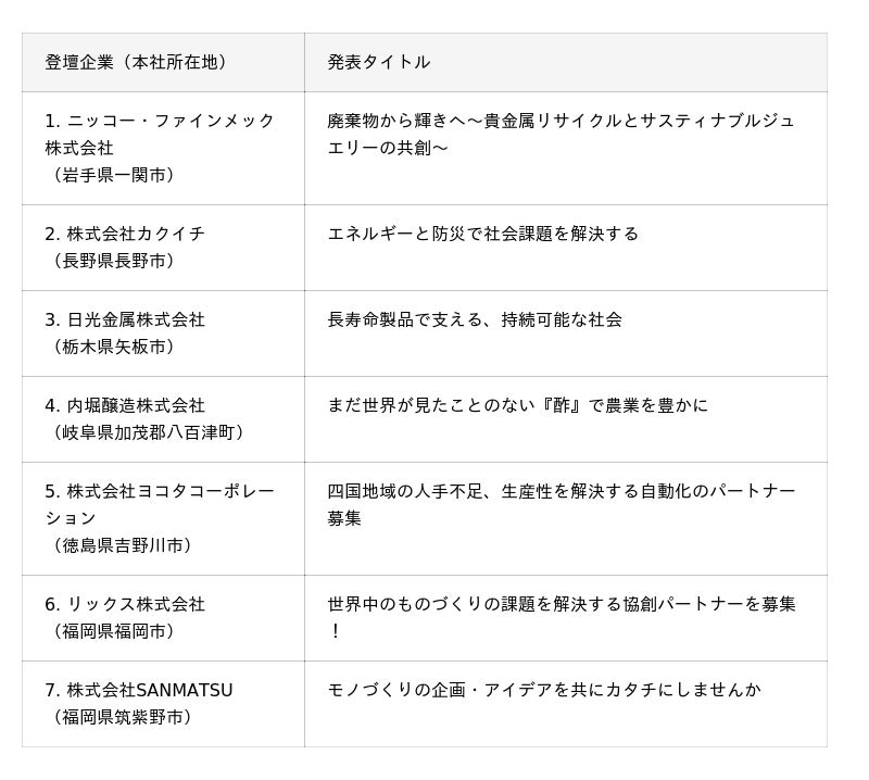 今回は新たに東北へもエリアを広げ、また、未来企業のみならず中堅企業や100億宣言企業へ対象を拡大し、各地域の企業7社の共創ニーズを発表します。