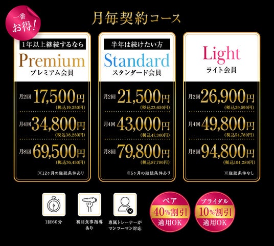 会員様の要望にあわせて「月毎コース」「回数券コース」「6ヶ月コース」をご用意しております。1ヶ月短期でコース回数を全て消化して頂いてもOKです。