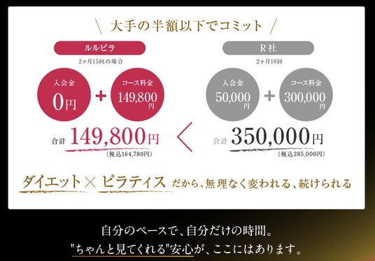 大手では2ヶ月30万円以上が相場ですが、ルルピラではその半額程度で「人生変える」体験を提供可能。