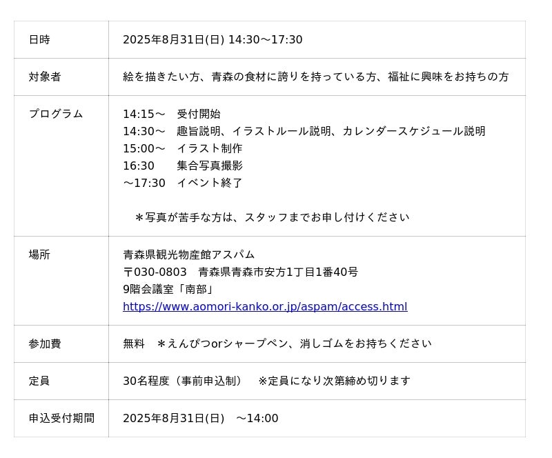 障がい者の仕事を作る、就労継続支援A型事業所を運営する青森福祉バンク株式会社(本社:青森市、代表取締役:白石直之)は8月31日(日)、関東で活躍するデザイナーのきびるアクション(所在地:埼玉県所沢市)嶋野詠子と、イラストを作成しカレンダーを作る商福連携イベント「青森の旬を描く会」をアスパムで開催します。